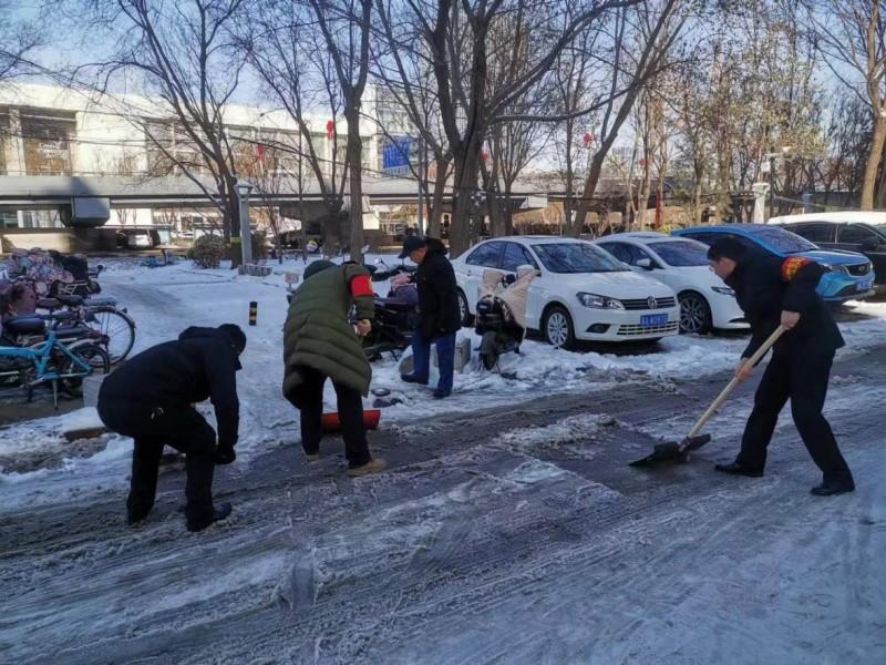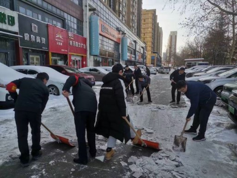 路面積雪經過行人及車輛的踩碾及降溫結冰變得又厚又硬,給清掃工作帶來了極大困難,但集團公司的黨員志愿者們不畏艱苦,干勁十足?;顒又校蠹曳止っ鞔_、相互配合,利用鐵鍬、雪鏟等工具,有條不紊地開展積雪清理活動,重點對停車場主干道、人行通道及自行車存放處進行了集中清理,確保了日常路面暢通和群眾出行安全。