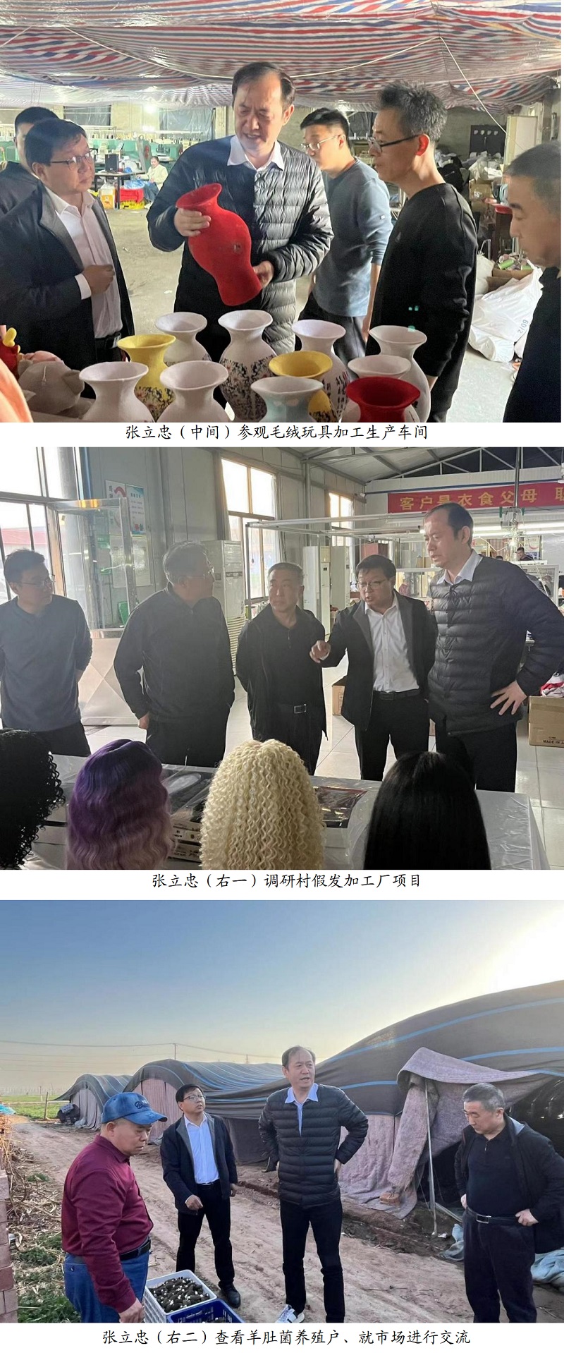 調(diào)研工作由曲周縣大河道鄉(xiāng)黨委書記王貴民陪同,參觀了毛絨玩具、假發(fā)加工車間和羊肚菌種植基地。會議中介紹了賈莊村當(dāng)前發(fā)展?fàn)顩r、存在問題以及未來發(fā)展規(guī)劃。下沉工作隊隊長齊連洪匯報了工作隊近期走訪調(diào)研及項目謀劃的工作進展和下一步工作打算。
